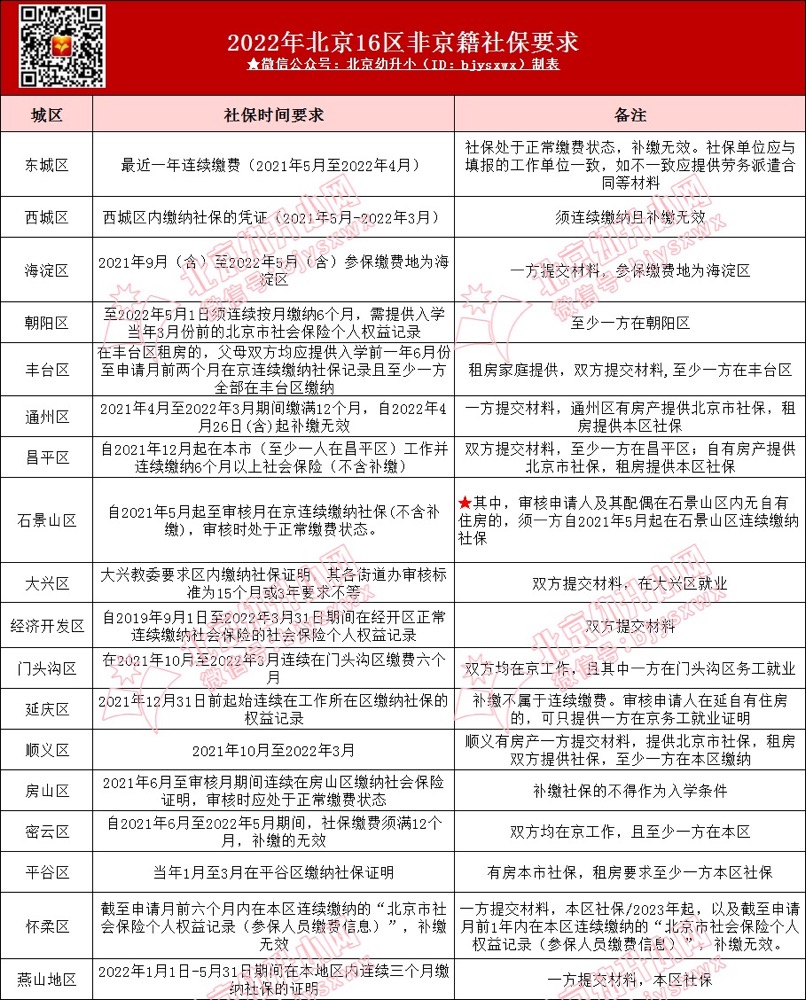 依据2022年各区非京籍入学要求来看,社保一般要求为半年至三年不等,同时部分城区有明确说明是否需父母双方均需提供社保,建议2023年非京籍家长根据入学城区要求进行提前准备: