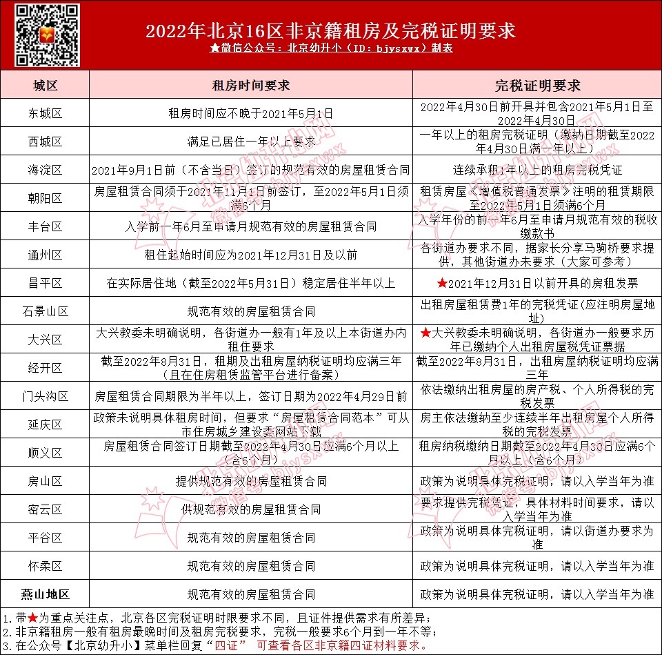 需要提醒大家注意的是,在京实际居住证明中包括租房合同和租房完税等要求,由于北京16区要求不同,建议大家提前了解入学城区提早准备,京京整理2022年各区非京籍租房要求,赶紧来看您所在城区是如何要求的↓↓↓