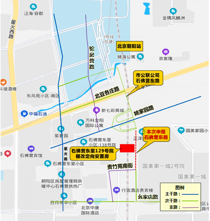 规划石佛营东路南起幺家店路,北至驼房营路,其中,北段姚家园路至驼房营路段为朝阳站配套道路之一,由公联公司负责实施。本次实施的为南段,该段道路紧邻已竣工的石佛营东里129号院棚改定向安置房,项目的实施既能满足安置房出行及市政接入需要,同时又能疏解朝阳站客流车流。