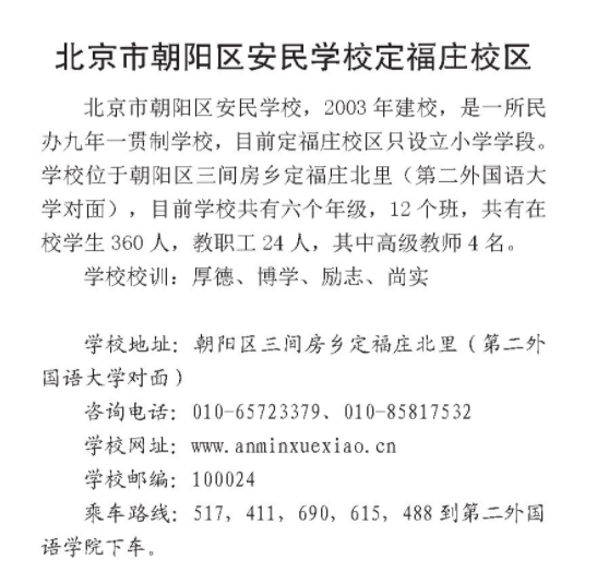 北京朝阳区各小学地址、教育理念、师资力量不同,为帮助各位家长对北京市朝阳区安民学校定福庄校区进一步了解,北京幼升小网团队为您分享相关内容。