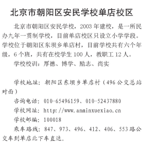 北京朝阳区各小学地址、教育理念、师资力量不同,为帮助各位家长对北京市朝阳区安民学校单店校区进一步了解,北京幼升小网团队为您分享相关内容。
