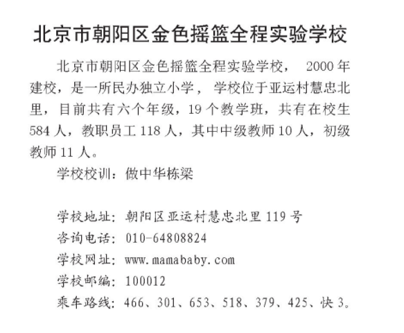 北京朝阳区各小学地址、教育理念、师资力量不同,为帮助各位家长对北京市朝阳区金色摇篮全程实验学校进一步了解,北京幼升小网团队为您分享相关内容。