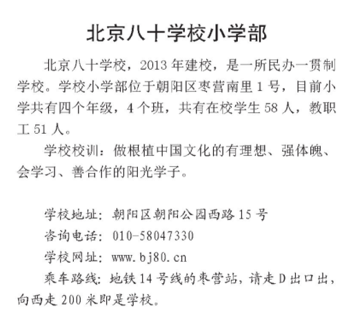 北京朝阳区各小学地址、教育理念、师资力量不同,为帮助各位家长对北京市朝阳区八十学校小学部进一步了解,北京幼升小网团队为您分享相关内容。