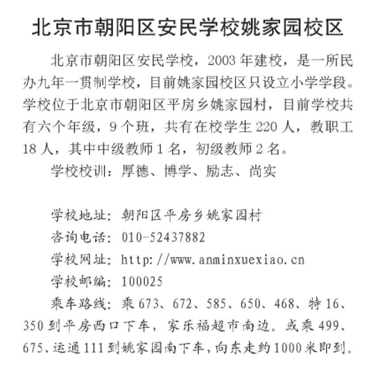 北京朝阳区各小学地址、教育理念、师资力量不同,为帮助各位家长对北京市朝阳区安民学校姚家园校区进一步了解,北京幼升小网团队为您分享相关内容。