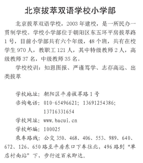 北京朝阳区各小学地址、教育理念、师资力量不同,为帮助各位家长对北京市朝阳区拔萃双语学校小学部进一步了解,北京幼升小网团队为您分享相关内容。