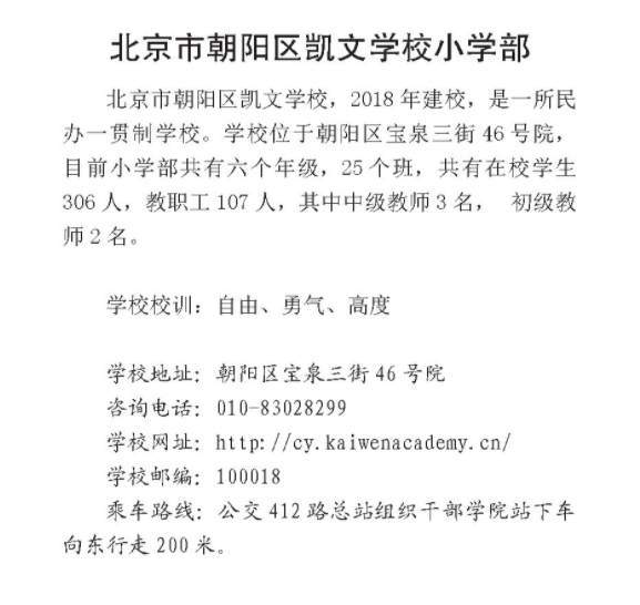 北京朝阳区各小学地址、教育理念、师资力量不同,为帮助各位家长对北京市朝阳区凯文学校小学部进一步了解,北京幼升小网团队为您分享相关内容。