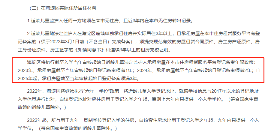 海淀区针对无房京籍在非户籍区海淀入学的适龄儿童,将执行截至入学当年审核起始日适龄儿童法定监护人承租房屋在本市住房租赁服务平台登记备案年限政策:2023年,承租房屋截至当年审核起始日登记备案须满1年;2024年,承租房屋截至当年审核起始日登记备案须满2年;自2025年起,承租房屋截至当年审核起始日登记备案须满3年。