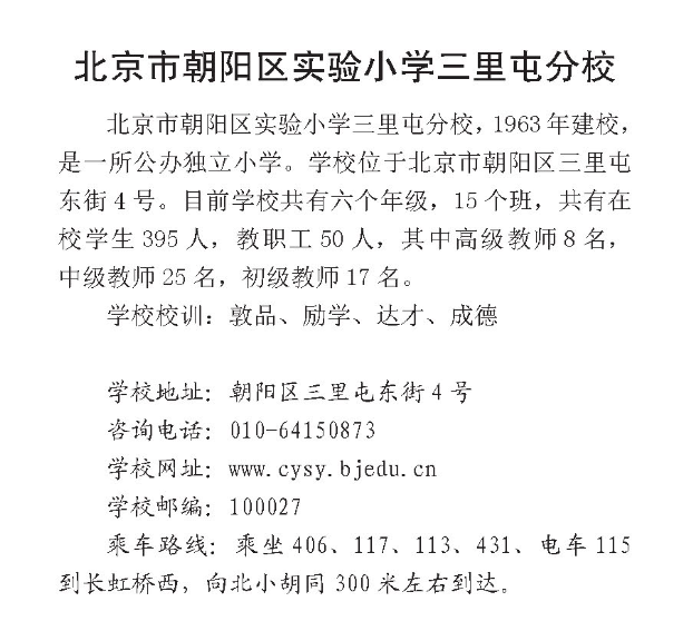 2023年幼升小参考:朝阳区各公办小学介绍大不同!现为您分享北京市朝阳区实验小学三里屯分校地址、联系电话、教育情况...北京幼升小网团队为您分享相关内容。