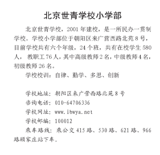 北京朝阳区各小学地址、教育理念、师资力量不同,为帮助各位家长对北京市朝阳区世青学校小学部进一步了解,北京幼升小网团队为您分享相关内容。