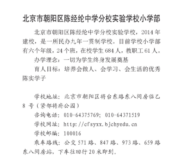 北京朝阳区各小学地址、教育理念、师资力量不同,为帮助各位家长对北京市朝阳区陈经纶中学分校实验学校小学部进一步了解,北京幼升小网团队为您分享相关内容。