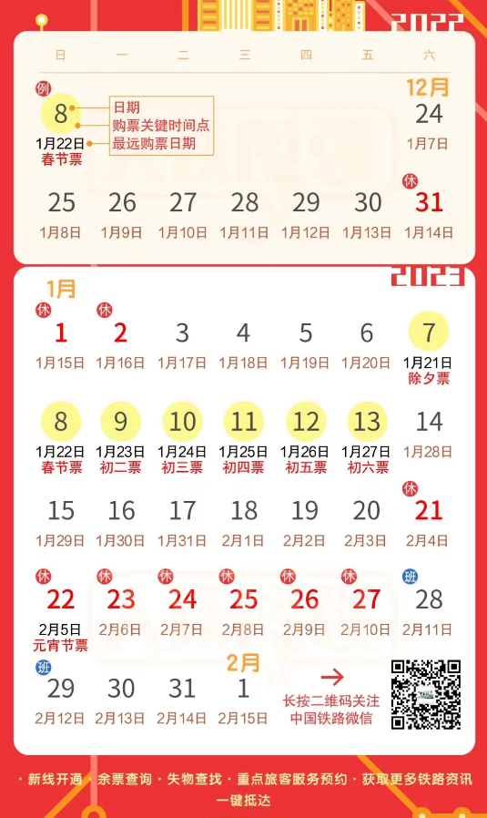 今日起至1月7日,2023年春运高峰期火车票将迎来销售高峰,7日当天可买除夕当日火车票。