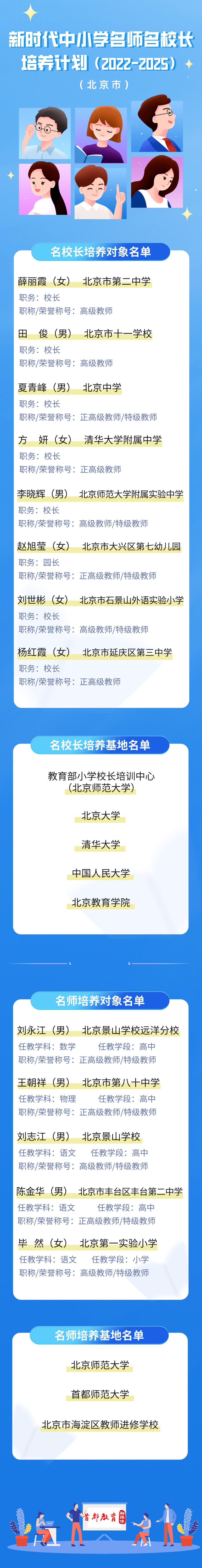 近日,教育部公布了《新时代中小学名师名校长培养计划(2022—2025)培养基地及培养对象名单》。其中,北京市确定8位校长为名校长培养对象、5家单位为名校培养基地;5位教师为名师培养对象,3家单位为名师培养基地。具体名单如下↓