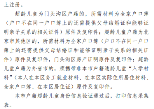 参考2022年门头沟区小学入学信息采集家长告知书:门头沟区京籍超龄儿童所需入学材料及入学手续如下: