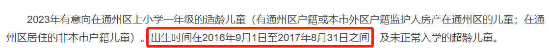 2023年通州区小学入学数据调查家长问答中,已经给出2023年幼升小适龄儿童的入学年龄范围为:出生时间在2016年9月1日至2017年8月31日之间。