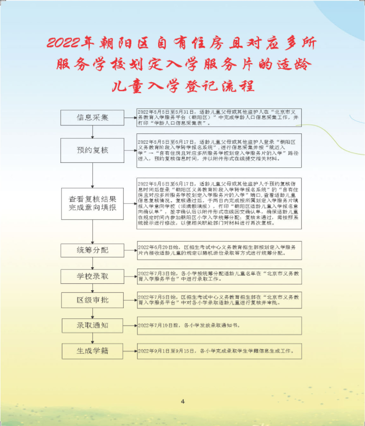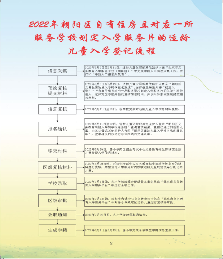 因2023年幼升小政策暂未发布,本文以2022年朝阳区义务教育阶段小学入学流程手册为您分享要求如下: