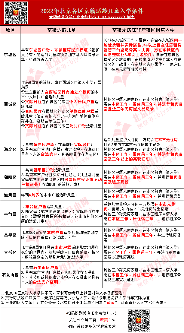 提醒:京籍一般按照房产或户口入学,如跨区入学需满足入学城区具体的要求,如无房跨区装入学需满足实际工作居住满三年并进行租房备案,建议2023年入学家长早做准备!