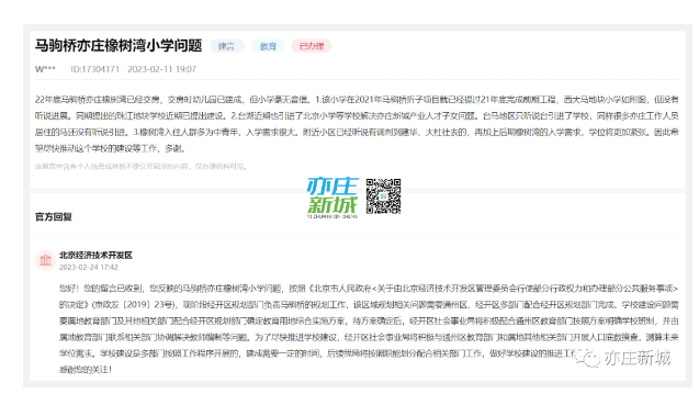 通州区马驹桥居民关心的“亦庄橡树湾小学问题”