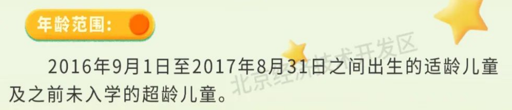 北京经济技术开发区小学入学数据调查通知中,同样也说明了入学年龄范围为在2016年9月1日至2017年8月31日之间出生的适龄儿童。