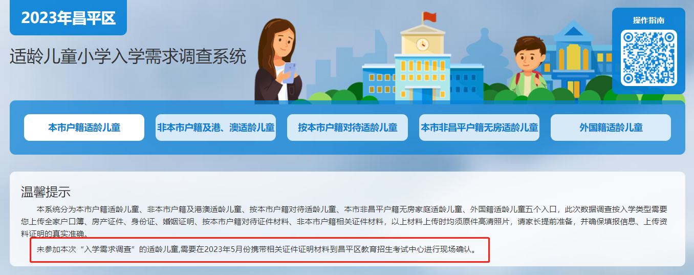 参考昌平区小学入学数据调查常见问题及解答:未参加本次“小学入学需求调查”的适龄儿童的法定监护人,请于2023年5月份携带全家户口簿、家长身份证、婚姻证明、居住信息相关材料和儿童医学出生证明,以上材料的原件及复印件,到昌平区教育招生考试中心经现场确认后,再完成北京市义务教育入学服务平台的填报工作。