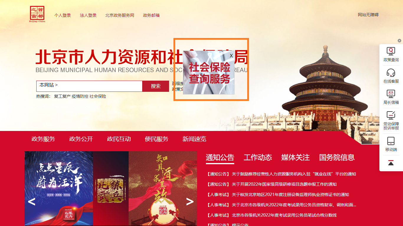 第一步:您可以登录“北京市人力资源和社会保障局”网站(http://rsj.beijing.gov.cn/),点击移动窗口“社会保险查询服务”。