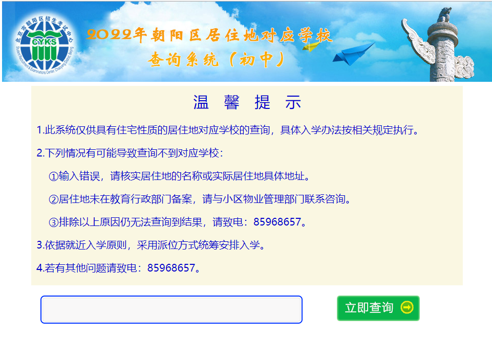 温馨提醒:目前2023年朝阳区中学划片系统暂未开放,以上为2022年朝阳区划片查询系统,2023年小升初家长可作为参考,具体请以入学当年实际情况为准。