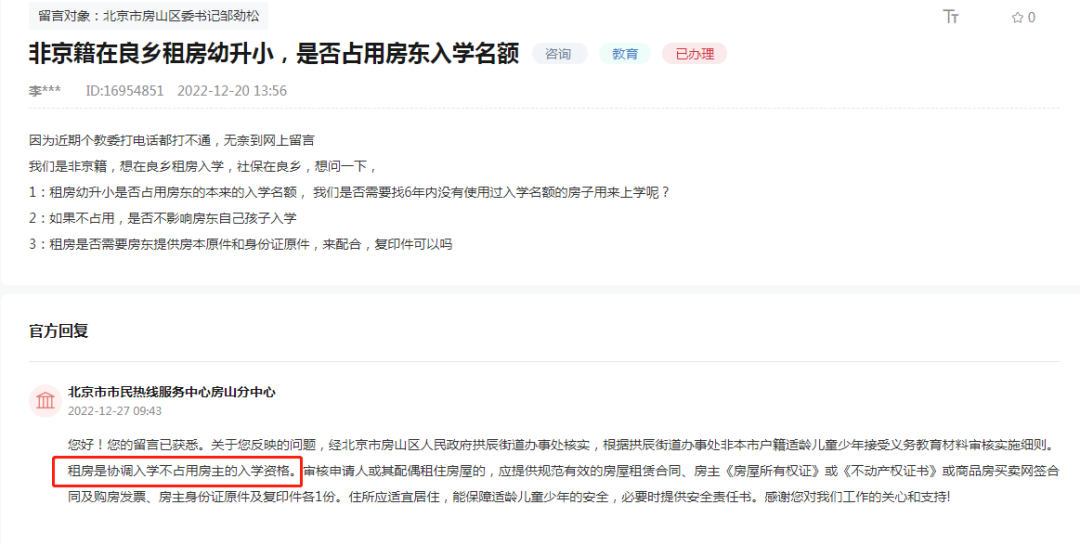 海淀区教委官方提问中回复了京籍幼升小学位占用问题: