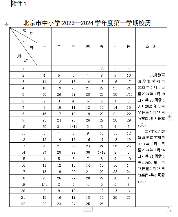 北京市中小学2023-2024学年度第一学期校历