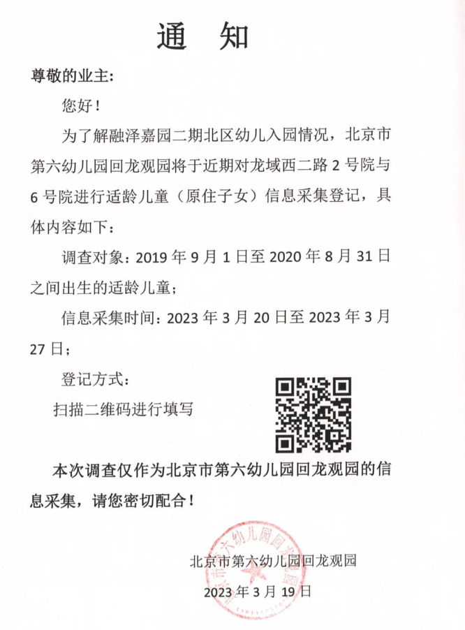 昌平区北京市第六幼儿园回龙观园2023年入园信息采集通知发布!针对融泽嘉园二期北区幼儿入园信息采集,北京幼升小网团队为您分享相关内容。