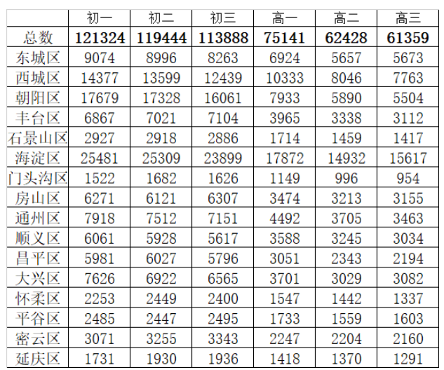 从数据来看,单看初三在读,海淀区人数最多,达到了23899人,然后是朝阳区,达到了16061人,然后是西城区12439人,这几个区域人数都上万。接下来是东城区和丰台区,具体数据如图所示。
