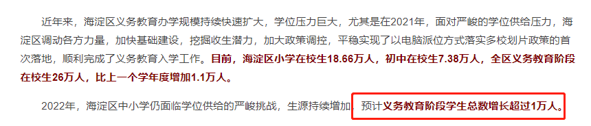 同时,在2022年海淀区义务教育阶段入学工作意见的通知中有说明,2022年海淀区义务教育学生总数增长超过1万人,海淀区面对生源增加、学位供给的挑战: