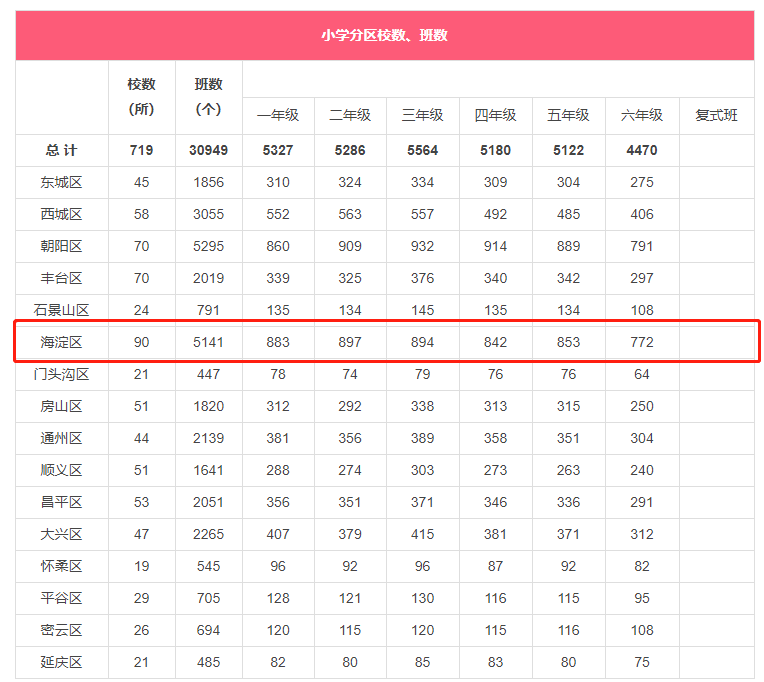 截至2022-2023学年度北京教育事业发展统计概况发布,海淀区小学一共有90所、共5141个班级: