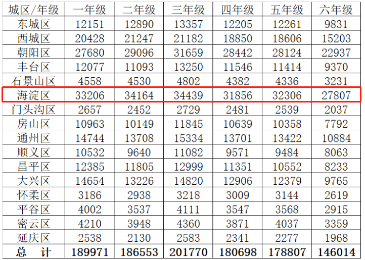 北京市教委公布了2022-2023学年度北京教育事业发展统计概况,其中海淀区小学阶段一年级至六年级各年级层在校人数详情数据可见下图: