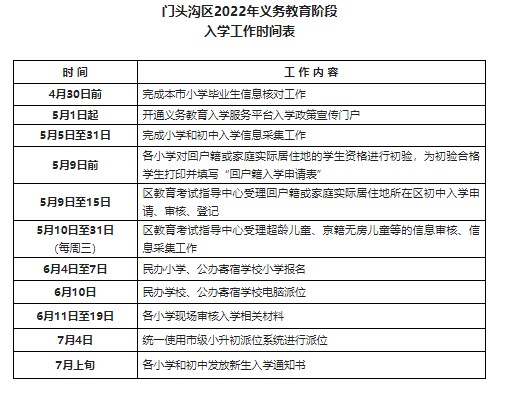 2023年门头沟区小学入学日程安排表