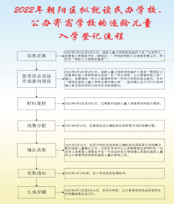 参考2022年朝阳区义务教育阶段小学入学流程手册,朝阳区民办校报名流程为:
