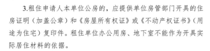 租住单位公房的,应提供单位房管部门开具的住房证明。租住办公用房、地下室的证明无效。