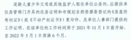 凡租住受雇单位公房的,应提供房屋产权证、单位房管部门开具的住房证明材料及单位人事部门提供的工作证明材料,工作时间应不晚于2021年5月1日(工作证明材料开具单位应与签署劳动合同单位一致)。