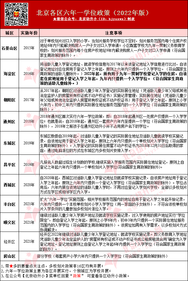 2、有些城区是部分小学实行六年一学位政策:如昌平区说明报名人数超过招生的学校、房山区是个别小学;