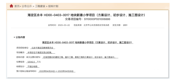 海淀学校建设的好消息!位于海淀永丰 HD00-0403-0017 地块的新建小学项目已经开始设计招标了!项目总投资估算约1.2亿元!快来看看吧!