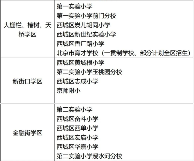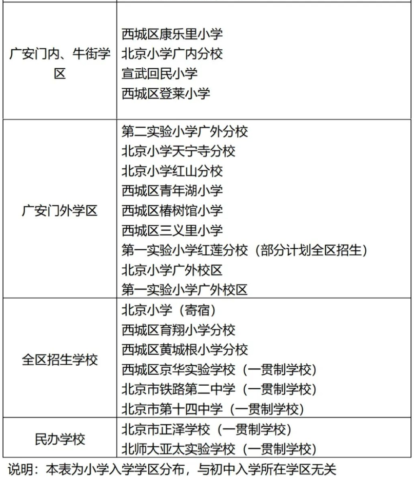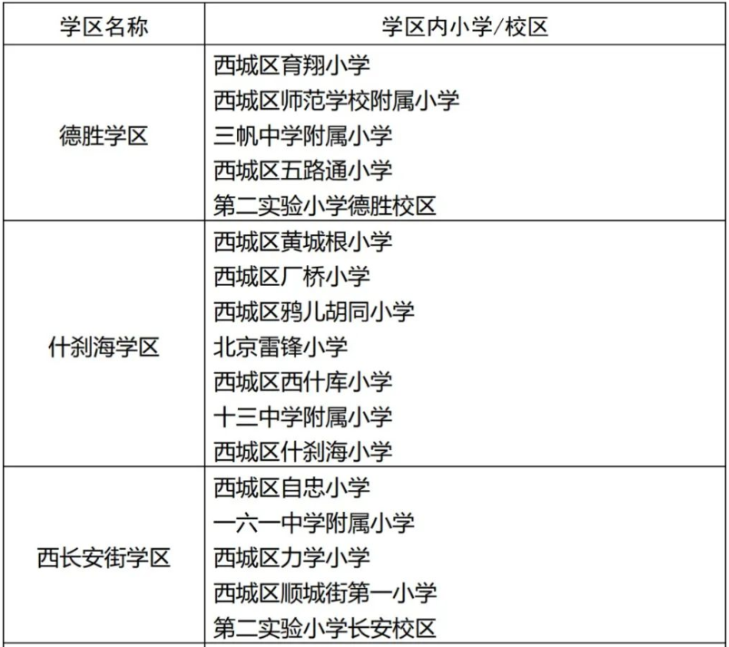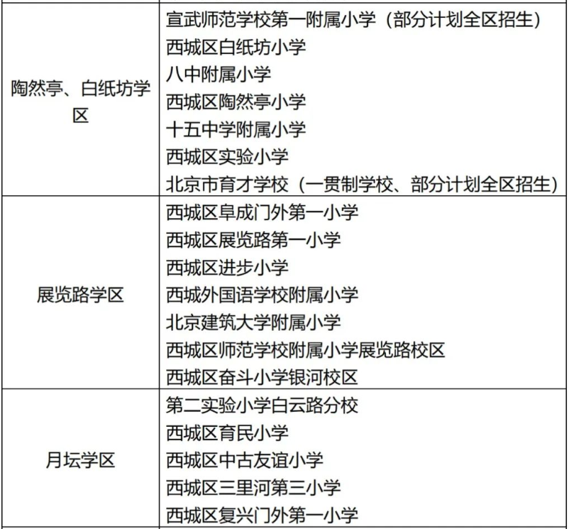 西城区2022年发布了学区划分的详细信息,一共11个学区分别对应不同的小学,具体名单如下: