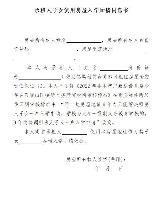 参考2022年石景山区义务教育入学咨询解答(100问),石景区租房入学需要房东本人到街道办现场签署房东知情同意书: