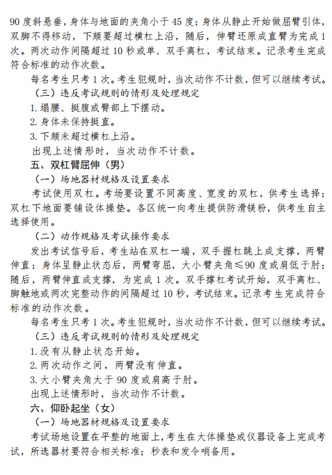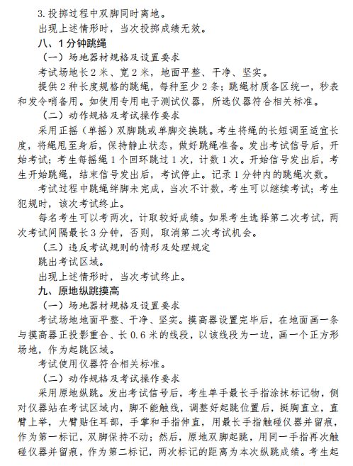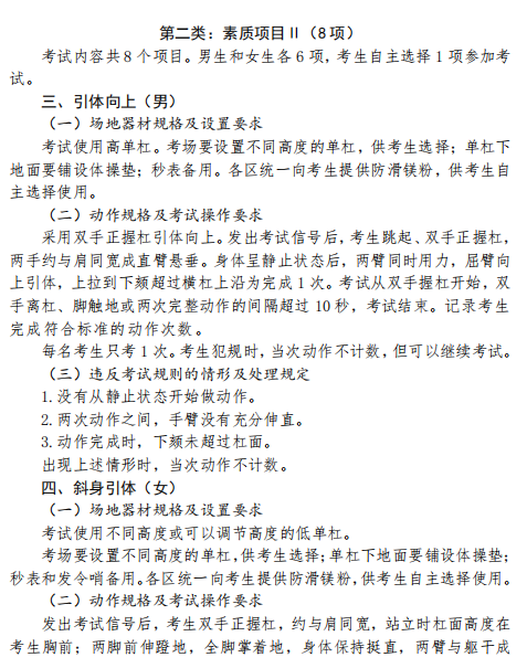 自2024年起,我市初三年级体育与健康考核评价现场考试内容调整为4类22项,具体包括素质项目Ⅰ(2项)、素质项目Ⅱ(8项)、运动能力Ⅰ(5项)和运动能力Ⅱ(7项),每名考生考4项,其中每类考1项,总分为30分。经市教委批准,现将《北京市义务教育体育与健康考核评价现场考试场地器材设置规范及项目考试规则(试行)》予以公布。