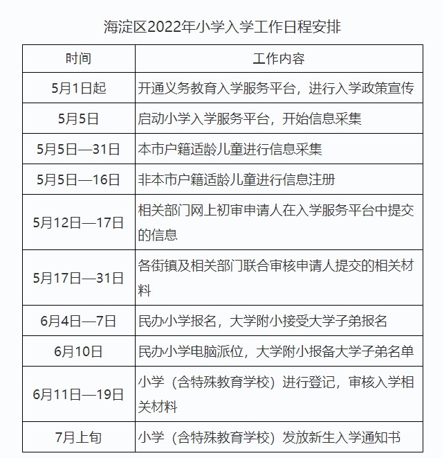 因2023年幼升小入学政策暂未发布,可先行参考各类人群2022年海淀区幼升小日程安排(具体请以2023年政策为准):