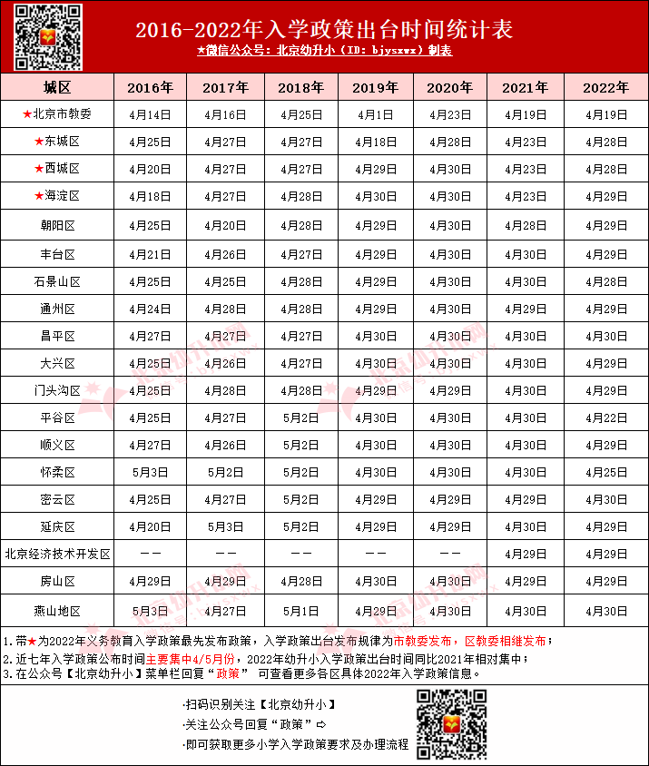 北京近几年北京市教委政策、各城区入学政策发布时间可参考下图: