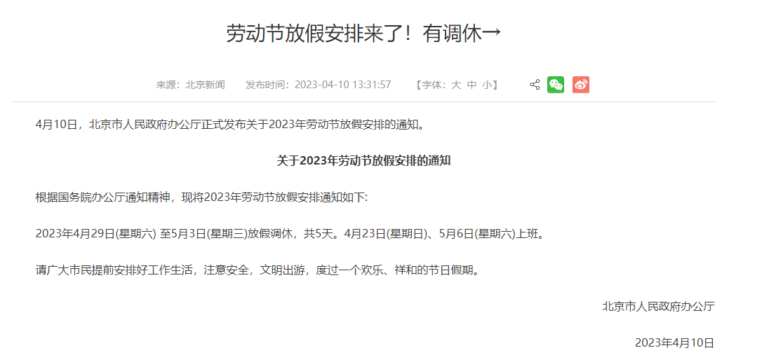 根据国务院办公厅通知精神,现将2023年劳动节放假安排通知如下: