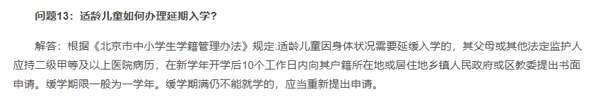根据《北京市中小学生学籍管理办法》规定:适龄儿童因身体状况需要延缓入学的,其父母或其他法定监护人应持二级甲等及以上医院病历,在新学年开学后10个工作日内向其户籍所在地或居住地乡镇人民政府或区教委提出书面申请。缓学期限一般为一学年。缓学期满仍不能就学的,应当重新提出申请。