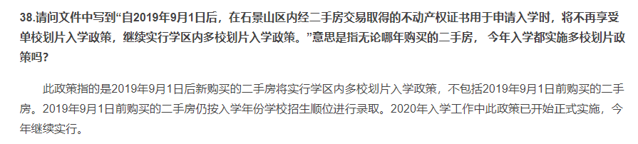 参考2022年石景山区义务教育入学咨询解答,石景山区2019年9月1日后新购买的二手房将实行学区内多校划片入学政策,2023年幼升小家长可提前了解,具体要求详见下图: