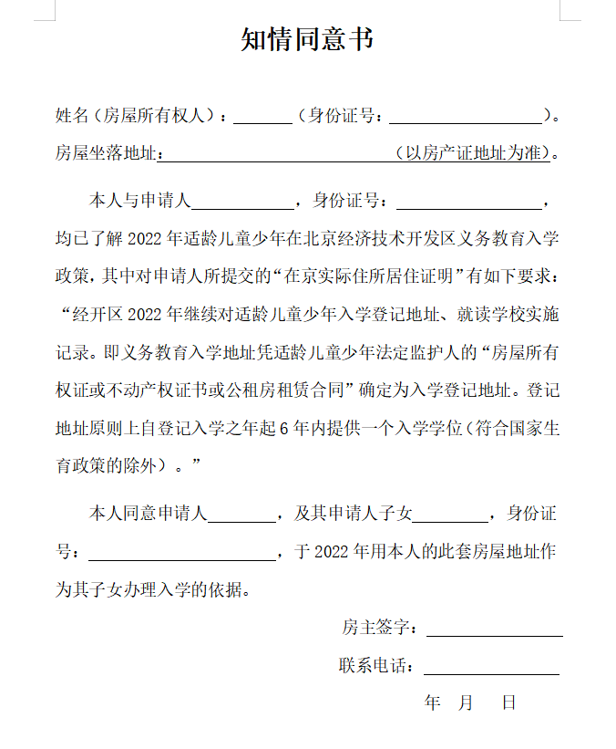 2023年北京经济技术开发区幼升小六年一学位房东知情同意书模板