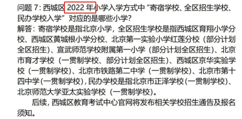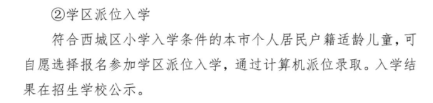 重要提醒:2023年幼升小政策未公布,以下信息摘自于2022年西城区义务教育入学政策原文(如下图),仅供参考,最终请以入学当年为准。