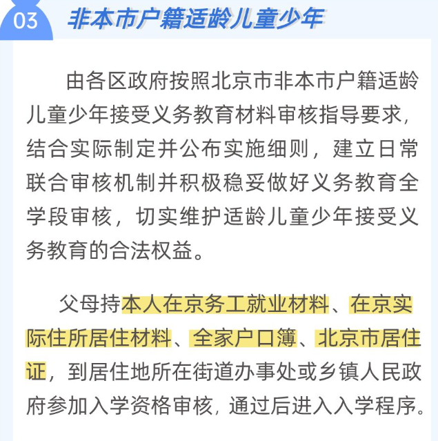 提醒:非京籍四证注意包括:在京务工就业证明、在京实际居住证明、全家户口簿和北京市居住证,各区要求不同,具体时限也有所不同,具体要求以入学城区发布为准。