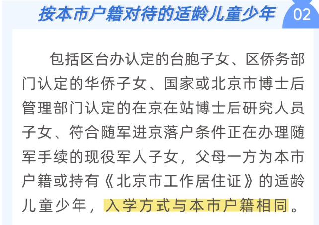 提醒:从目前发布的市教委政策来看,以上6类人群属于按京籍对待人群,满足入学城区要求无需准备非京籍“四证”!